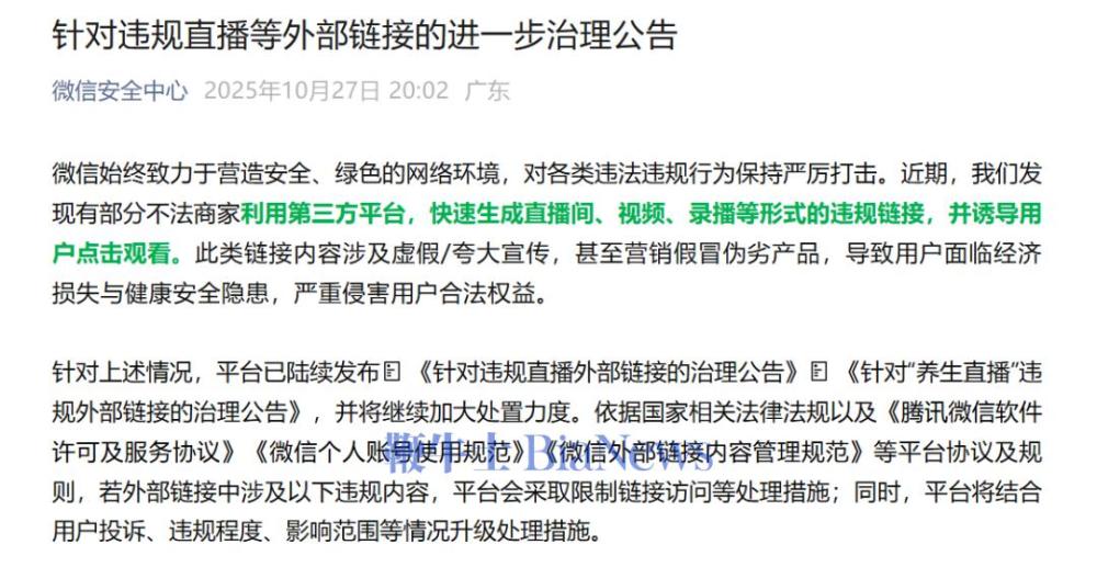 3月7日,发布《针对“养生直播”违规外部链接的治理公告》,若外部链接中的直播内容涉及违规发布医疗、药品、保健食品等信息,微信端会限制链接访问。